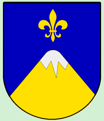 Ein goldener Berg mit silberner Spitze auf glauem Grund, gekrönt von einer Lilie.