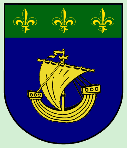 Auf blauem Grund eine goldene Kogge, darüber ein Schildhaupt in grün belegt mit drei goldenen Fleur-de-lis.