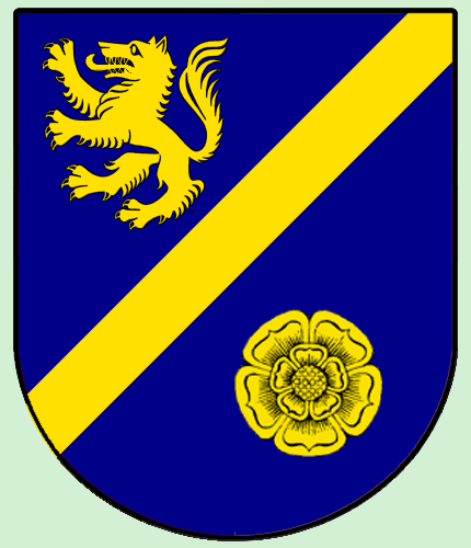 Auf blauem Feld 2 goldene Apfelblüten über einem nach unten gerichteten, goldenen Winkel.