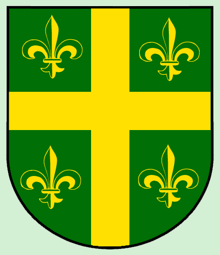 Auf grünem Grund ein goldenes Kreuz zwischen vier goldenen Fleur-de-lis