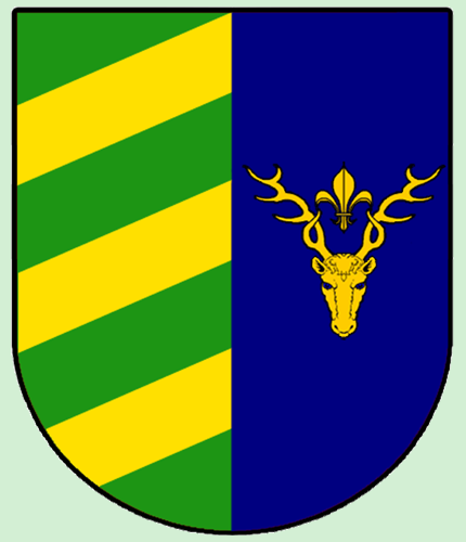 Der Schild ist längs geteilt. Recht auf grünem Feld drei schräglinke Balken in Gold. Links auf Blau der goldene Kopf eines Hirschs, in dessen Geweih eine goldene Fleur-de-lis ruht.