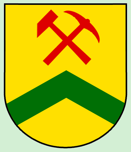 Auf goldenem Grund ein grüner Winkel, darüber im Schildhaupt in rot Hammer und Picke gekreuzt.